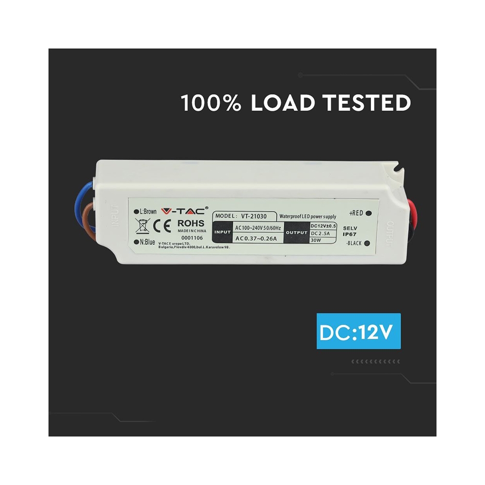 Durata de viațã: 20 000 ore Putere: 30W Curent: 2.5A Tensiune intrare AC: 100-240V, 50/60 Hz Tensiune de ieșire: 12 V Detalii despre corp Material: ABS, PC Cicluri On / Off: > 15000 Condiții de lucru: nu este adecvat pentru utilizare în condiții extreme. Condițiile normale de lucru sunt cele cu temperaturi cuprinse între -20 ° ... + 45 ° C Grad de protecție IP: IP67 Greutatea articolului: 0,3 kg